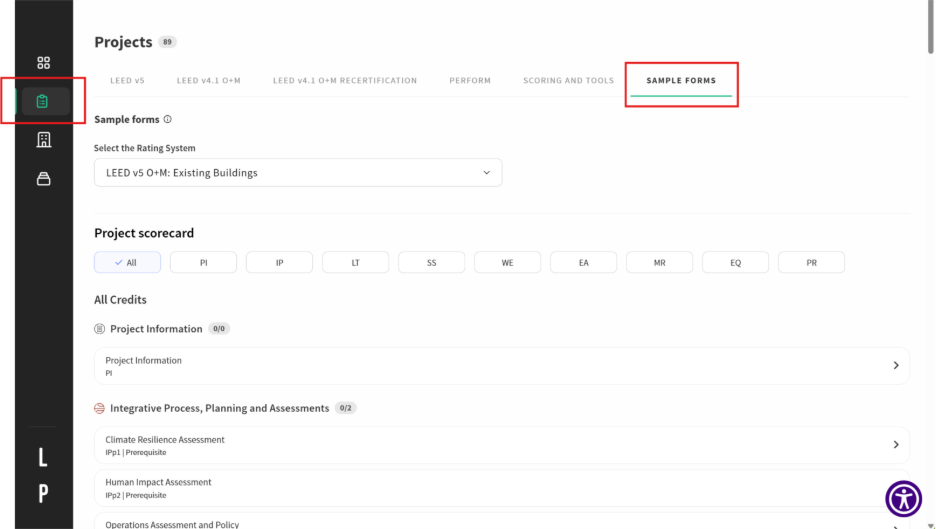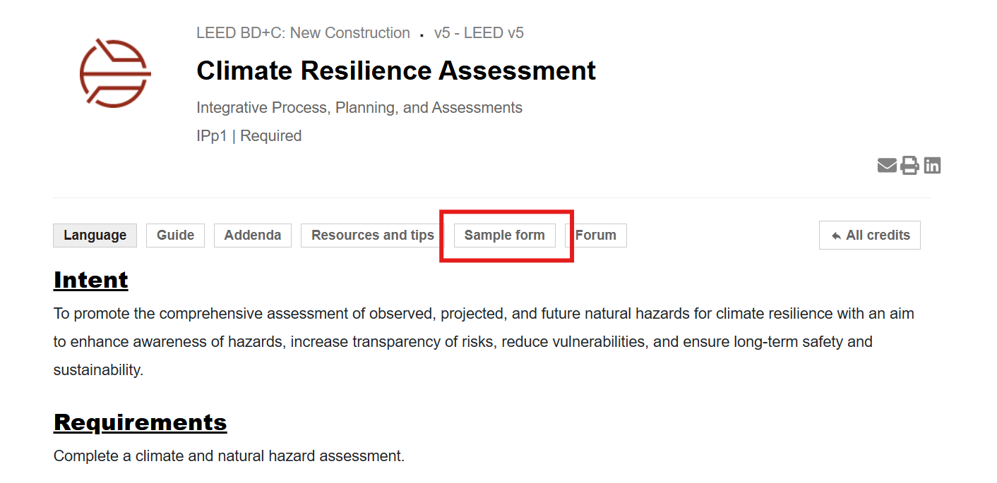 Sample credit forms for LEED v5 BD+C, ID+C, and O+M projects are available in a few locations: